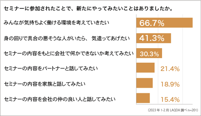 社内セミナー実施で、ポジティブな行動変容が 98.5%。「みんなが気持ちよく働ける環境を考えていきたい」との回答が66.7%。「身の回りで具合の悪そうな人がいたら、気遣ってあげたい」は41.3%。
