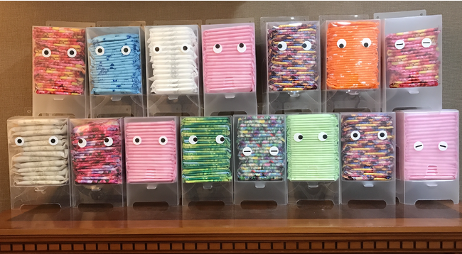 試作を行う過程で、生理用品の残量が見えることも使う人の安心感に繋がり、半透明・クリアの2色での展開をしました。中身が見えるようにすることで、生理用品個包装の意匠デザインが映え、POPな佇まいを実現しています。また、目がついたかわいいデザインにすることで、男性にも気兼ねなく「かわいい!」とのコメントが寄せられました。シンプルなデザインではありますが、目の表情にバリエーションがあり、さまざまな色や柄の生理用品を入れることができます。そのため、同じケースでも、目と中の生理用品が変わることによって、バリエーションのある雰囲気が出せ、それぞれの施設で楽しくお使いいただけると考えております。