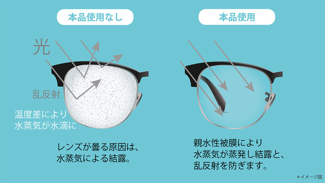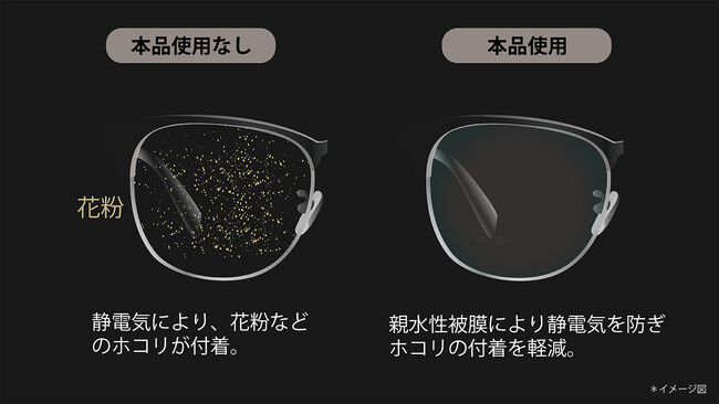 この親水性被膜の機能は、花粉だけでなく曇り止めの効果もあり、梅雨の時期などに眼鏡が曇る人々のお悩みも解消します。