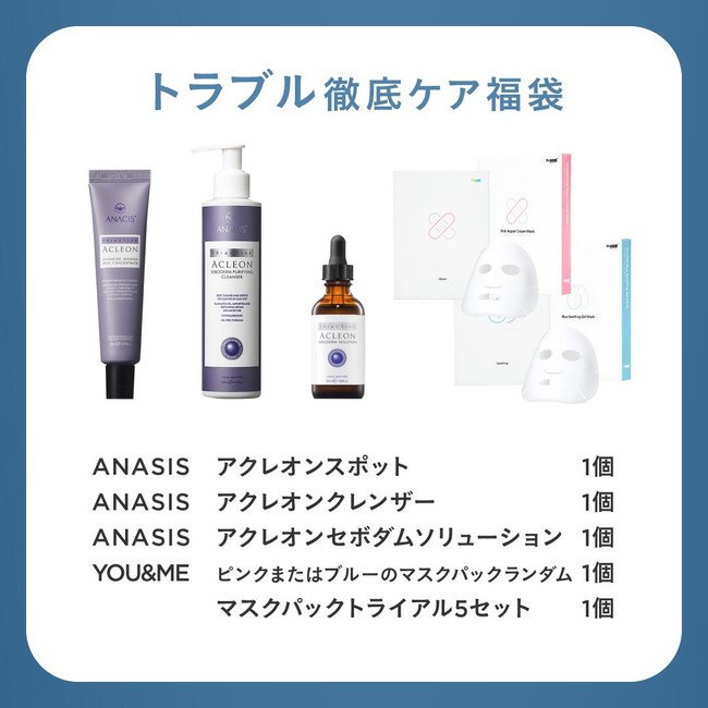 お肌トラブルの味方である2021年大人気であった「ANACIS(アナシス)」のアクレオンシリーズから軟膏タイプのアクレオンスポット、さっぱりと洗顔ができるアクレオンクレンザー、しっかりと保湿もできる美容液アクレオンセボダムソリューションの3点に加え、「YOU&ME(ユーアンドミー)」日本では珍しい美容液タイプのピンクのマスクパックとお肌の水分補給ができるブルーのパックをランダムで1点を組み合わせた限定福袋です。