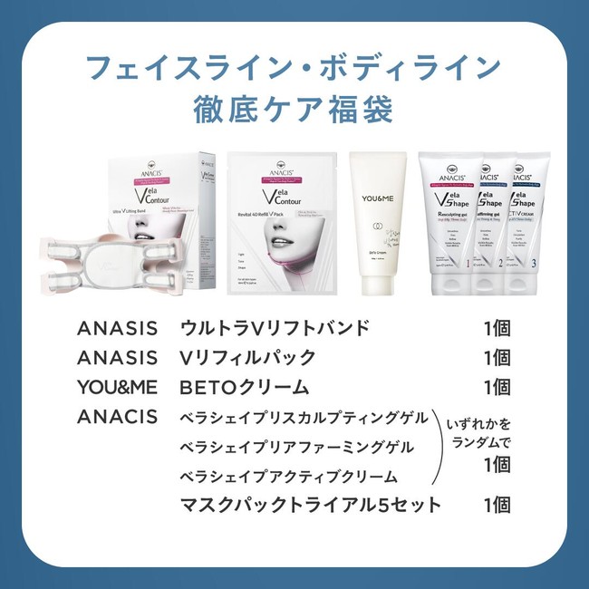 フェイスラインを徹底してケアできると「Meon.」で一番人気のシリーズから「ANACIS(アナシス)」のウルトラVリフトバンド1点とVリフィルパック1点、妊娠線や肉割れを乾燥から守りケアしてくれる「YOU&ME(ユーアンドミー)」のBETOクリーム1点、セルライトが気になる方やボディラインを引き締めたい方におすすめな「ANACIS(アナシス)」ベラシェイプリスカルプティングゲル、ベラシェイプリアファーミングゲル、ベラシェイプアクティブクリームの中から1点を組み合わせた限定福袋です。