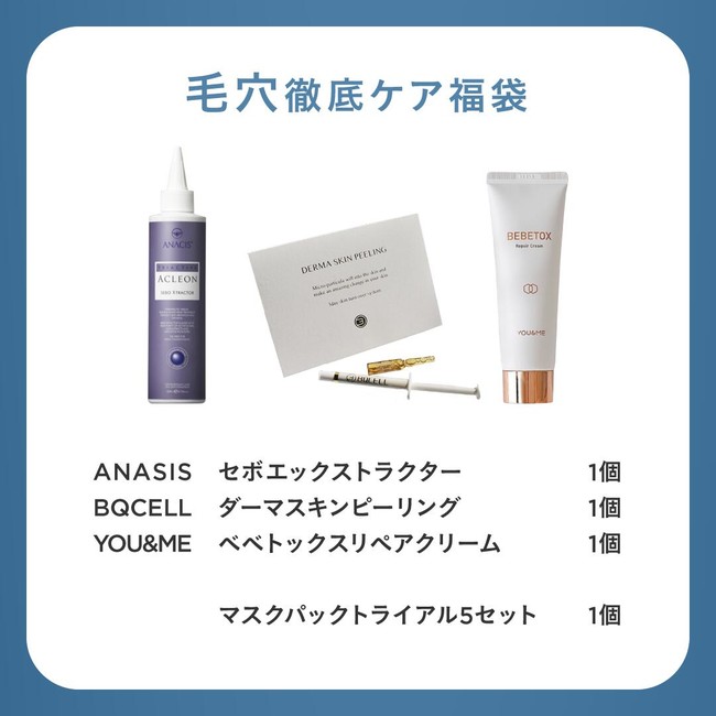 お肌に負担をかけず角質・いちご鼻をケアできると有名な「ANACIS(アナシス)」のセボエックストラクター1点、おうちでハーブピーリングを体験できる「BQCELL(ビーキューセル)」のダーマスキンピーリング1点、毛穴ケア後にしっかりと保湿ケアのできる「YOU&ME(ユーアンドミー)」のベベトックスリペアクリーム1点が組み合わされた限定福袋です。