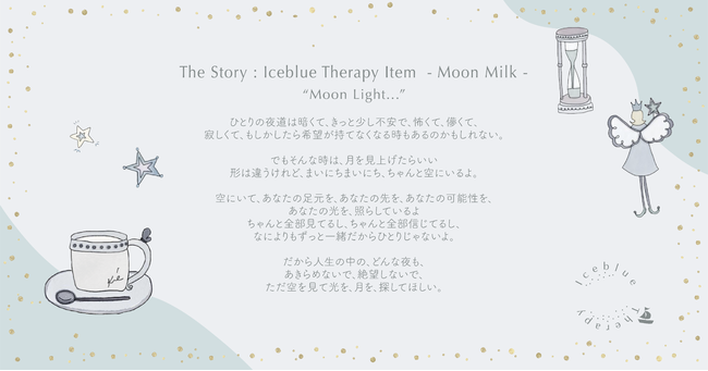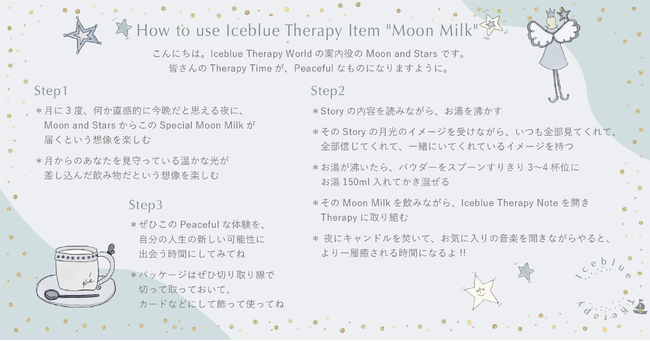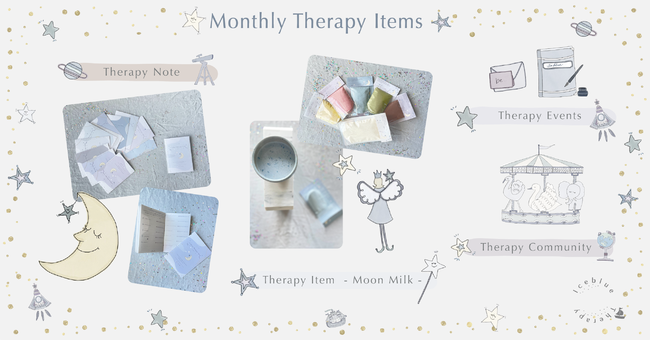 ご入会いただいたIceblue Therapy Memberさまには、毎月Iceblue Therapy NoteとTherapy Item - Moon Milk -、Therapy Event Ticketが届きます。