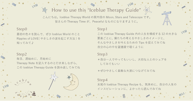 「Iceblue Therapy」は、#Product #Community #Event で構成される、動物・地球・わたしたちのためのTherapyブランドです。 Iceblue Therapyは、本日からの申し込み受付開始の上で、4月1日(金)からのサービスご提供開始をいたします。ご入会いただくと、Iceblue Therapy Special Welcome Kitのほか、毎月Iceblue Therapy NoteとTherapy Item - Moon Milk -、Therapy Event Ticketが届き、毎日の自分の心の中にきらきらしたやさしい拠り所を作れます。