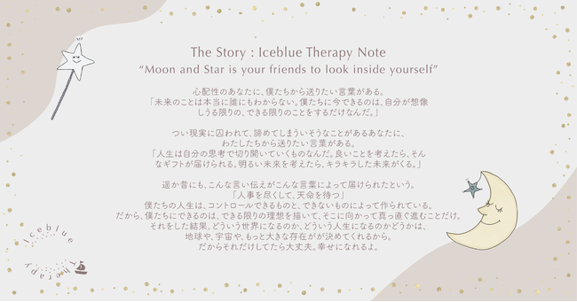 「Iceblue Therapy Note」は、あなたのためのセラピージャーナリングノートです。ジャーナリングを進めると、まるでセラピーを受けたかのような穏やかで軽やかな気持ちに、望遠鏡と月星が導いてくれます。