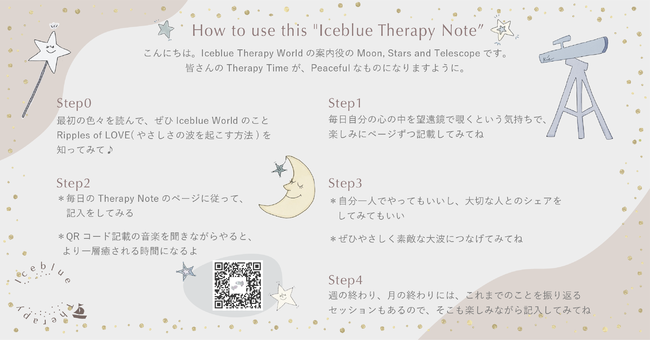 「Iceblue Therapy Guide」は、あなたのためのセラピージャーナリングノートです。ジャーナリングを進めると、まるでセラピーを受けたかのような穏やかで軽やかな気持ちに、望遠鏡と月星が導いてくれます。