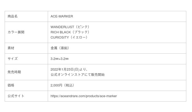 株式会社WISTRIA(代表取締役社長:藤澤桃子)が展開する細身女性のためのゴルフブランド「ACEANDRARE(エースアンドレア)」から上質なメタルマーカーが新登場。最大の特徴はマーカーではまず見ない正方形の形状。国内生産にこだわり、利益度外視で製造。4社、技術違いの職人が携わり、すべての工程が手作業。カラーは全3色(ピンク、黄色、黒)。公式オンラインストア(https://aceandrare.com/)にて発売中。
