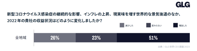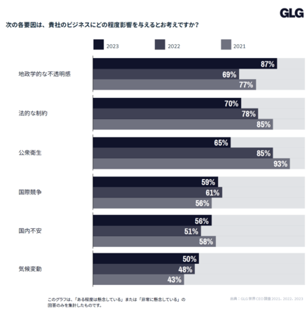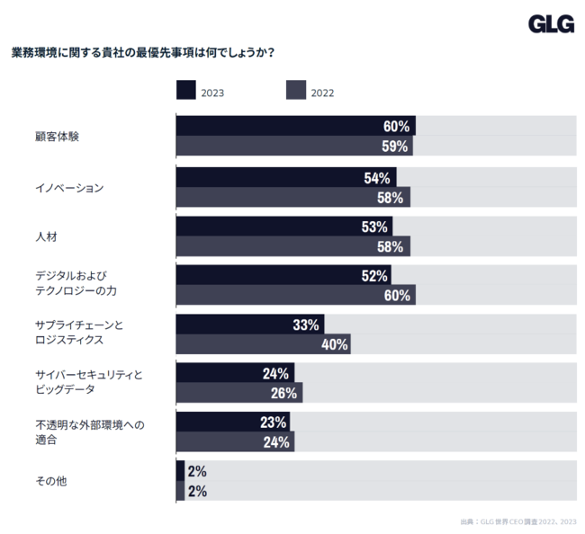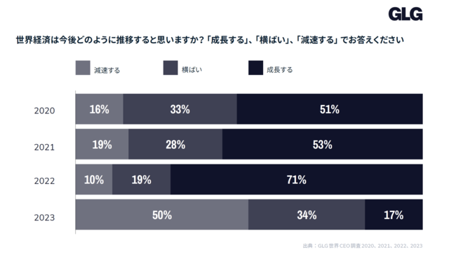 グローバル・インサイト・ネットワークである、株式会社 Gerson Lehrman Group(以下、GLG、本社所在地:東京都港区、代表取締役社長:橋本勇人)は、『2023年世界CEO調査』日本語版の調査結果を発表したのでお知らせいたします。