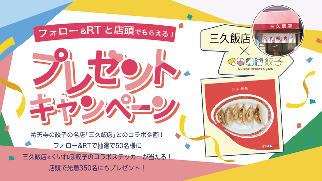 4月28日(金)から、「くいれぽ餃子」公式Twitterアカウントにて、抽選で50名にあたるTwitterフォロー&RTキャンペーンを実施。また5月9日(火)からは、「三久飯店」の店頭にて先着350名に無料プレゼントをするキャンペーンを開始します。