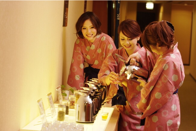 清潔感あふれる和モダンな館内は兵庫県の伝統工芸品「豊岡杞柳細工」をモチーフにデザイン。オリジナルのピンク色(女性)の浴衣に着替えた後は、美人の湯といわれ肌にも優しい泉質を上質なアメニティとともに湯あみできます。湯上り後はティーコーディネーター厳選の上質なお茶を、湯上り処や和モダンな客室でお愉しみいただけます。