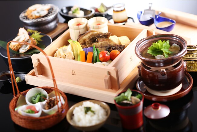 夕食・朝食ともに身体に優しいをテーマとした創作会席をご提供しています。特に朝食名物「せいろ蒸し」は、蒸すことで栄養が凝縮された温野菜はヘルシーで冷え性対策にもなると、料理長が発案。旅の最後までお喜びいただけるよう、お客様がご着席とともに1つ1つのテーブルに手間暇かけてお届け致します。