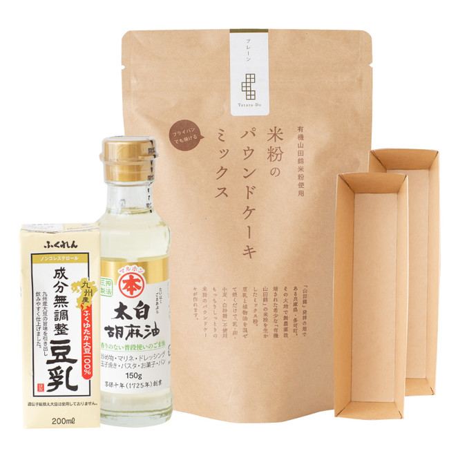 有機山田錦米粉を使ったパウンドケーキミックス粉に、パティシエが厳選した太白ごま油と豆乳、紙製ミニパウンド型がセットになったベイキングキット。乳・卵・小麦・白砂糖不使用のパウンドケーキづくりに必要なものがすべて揃って、思い立った時にすぐ焼けるのが魅力です。お子様と一緒にお菓子づくりを楽しみたい場面にもぜひどうぞ。