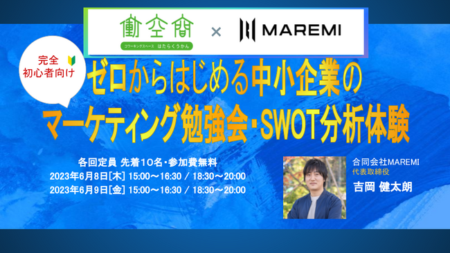合同会社 MAREMI(本社:埼玉県秩父郡皆野町、代表取締役:吉岡健太朗)は、働空間と合同で「知識ゼロからはじめるマーケティング勉強会・SWOT分析体験会」を6月8日(木)、6月9日(金)の2日間連続でコワーキングスペース働空間で開催いたします。ビジネス戦略の基礎となる内容と最新の情報を、オープンスペースで働く・出会う新しい働き方ができる空間でご提供いたします。会場は「働空間」秩父ビジネスプラザ 3F会議室。より多くの方が参加しやすいように計4日程の講演。(申し込み先:https://www.jicoo.com/t/maremi/e/2306seminar?date=2023-06-08&tz=Asia%2FTokyo)