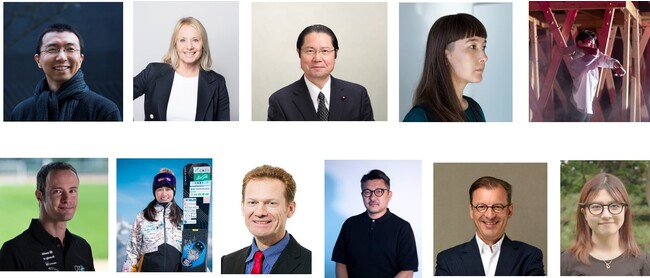 上段左から 藤本 壮介(ふじもと・そうすけ)建築家、エリザベト・シュナイダー=シュナイター(Elisabeth Schneider-Schneiter)スイス国民議会議員/スイス・日本友好議員連盟会長、衛藤 征士郎(えとう・せいしろう)衆議院議員/日本スイス友好議員連盟会長、マヤ・ミンダー(Maya Minder)アーティスト/キュレーター/料理人、小尻 健太(こじり・けんた)ダンサー・振付家