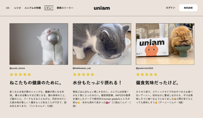 ねこのごはん選びに悩まれている方や、ご利用検討中の方のために、実際にuniamをご利用いただいたねこと飼い主様のリアルな声を掲載いたしました。