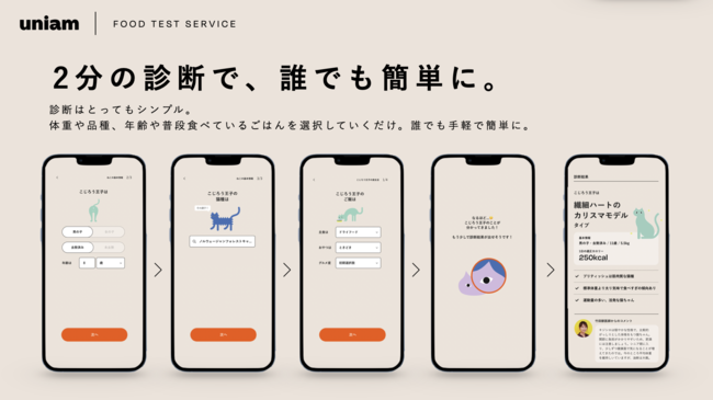 また、飼い主のごはん悩みに寄り添うため、ねこの体重や年齢、品種など、13の質問に答えるだけで、獣医師がおすすめのフードプランを提案する診断サービスも展開。ごはん選びにかけていた時間を減らし、ストレスフリーな購入体験を提供しています。