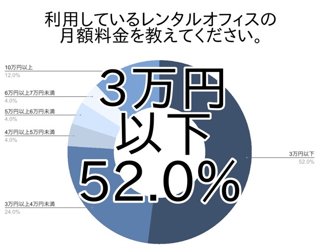 最も多かったのは3万円以下で、過半数(52.0%)を占めました。さらに範囲を広げると、4万円未満の割合が全体の4分の3以上を占める(76.0%)ことがわかりました。比較的低価格のレンタルオフィスが好んで利用されている傾向にあります。