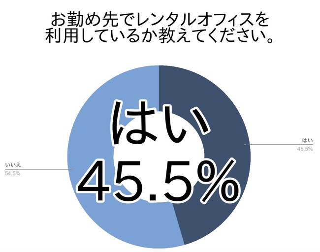今回のアンケートでは勤務先でレンタルオフィスを利用していると答えた方は45.5%という結果になりました。回答者勤務先のうち半数弱もレンタルオフィスを利用しているのは、思ったより多いと感じる方が多いのではないでしょうか。