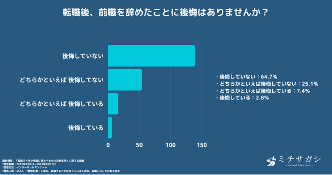 前職を辞めたことの後悔に関し、「後悔していない」と答えた方が64.7%、「どちらかといえば後悔していない」と答えた方が25.1%、「どちらかといえば後悔している」と答えた方が7.4%、「後悔している」と答えた方が2.8%という結果でした。