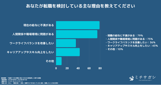 転職を検討している主な理由に関し、「現職の給与に不満がある」と答えた方が79%、「人間関係や職場環境に問題がある」と答えた方が75%、「ワークライフバランスを改善したい」と答えた方が36%、「キャリアアップやスキル向上をしたい」と答えた方が43%、「その他」と答えた方が10%という結果でした。