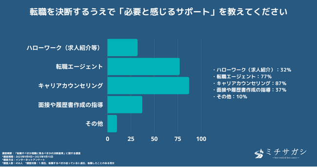 転職を決断するうえで必要と感じるサポートに関し、「ハローワーク(求人紹介)」と答えた方が32%、「転職エージェント」と答えた方が77%、「キャリアカウンセリング」と答えた方が87%、「面接や履歴書作成の指導」と答えた方が37%、「その他」と答えた方が10%という結果でした。