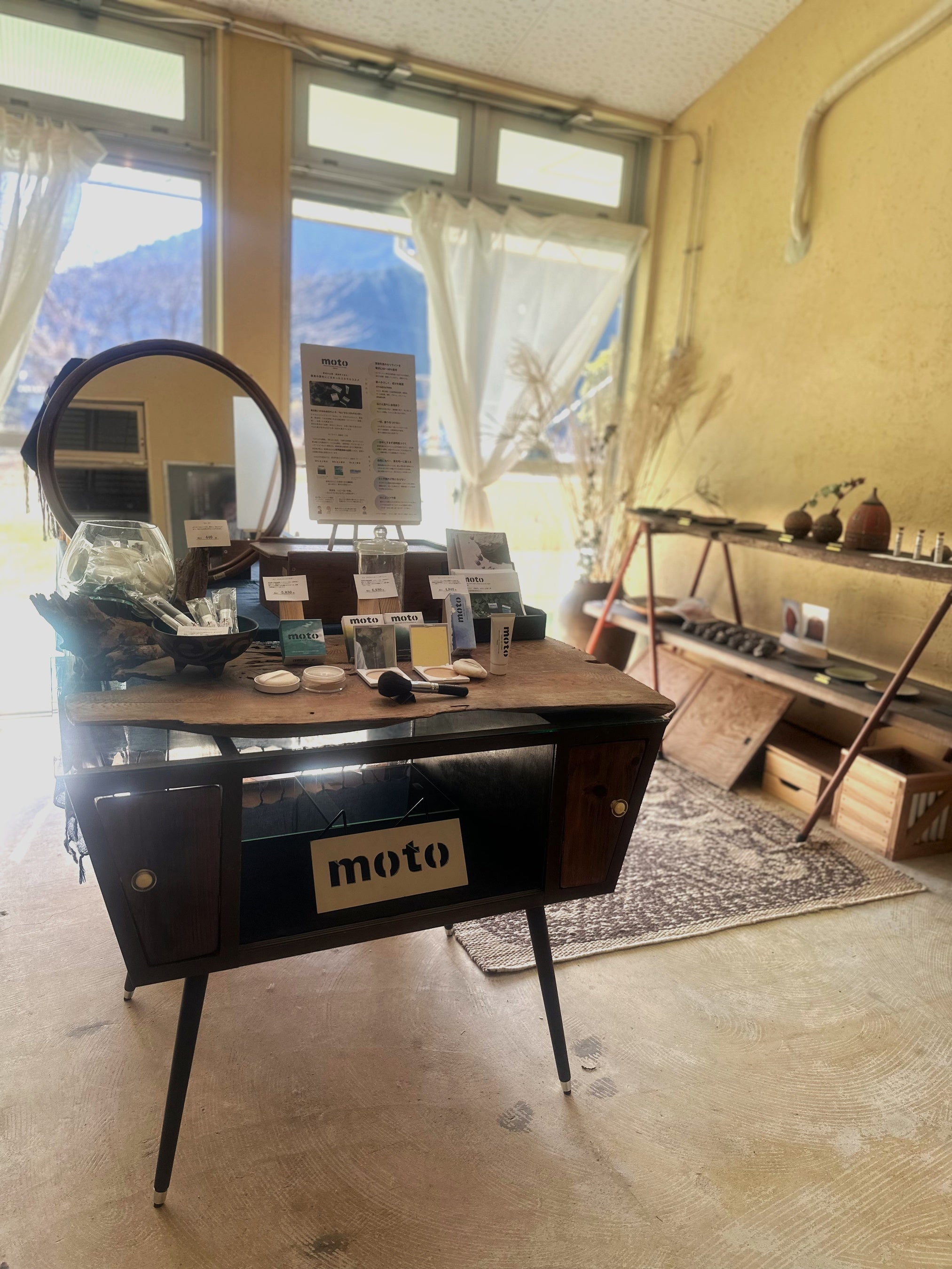 東栄町で採れる鉱物・セリサイトを使った化粧品ブランド「moto(モト)」の製品に加え、町の特産品や、町在住の陶芸作家・山本幸嗣氏の作品など、地域の魅力を伝える品々を取り揃えています。