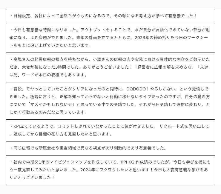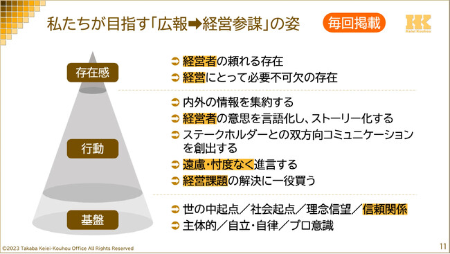 経営者のビジョンや意図に対して、広報機能とスキルを駆使して応えることが私たちの役割です。セミナーの最後には、経営者の意向を理解し、それに対する広報戦略をどのように策定するかが重要であるというメッセージで締めくくられました。