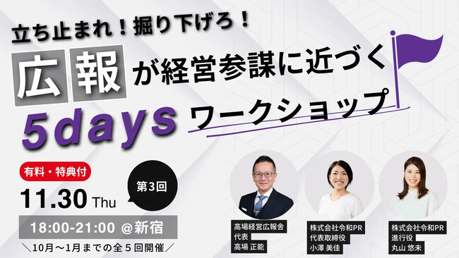 「PRで世界を変える」をミッションに掲げる株式会社令和PR(本社:東京都世田谷区、代表取締役 :小澤美佳)は11月13日(月)に、広報が経営参謀に近づく5Days ワークショップをオフラインにて開催いたしました。今回セミナーレポートとして当日の様子やアンケート結果をお届けします。