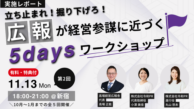 『立ち止まれ!掘り下げろ! 広報が経営参謀に近づく5Days ワークショップ』と題した有料ワークショップの第2回を、11月13日に開催いたしました。今回は当日のレポートをお伝えいたします。