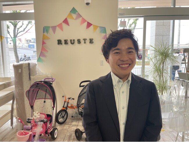 皆さん、はじめまして。「ふくちゃん リユスタ」の企画・運営を担当している藤本です。僕は元々、「FUKU CHAN」のバイヤーとして活動していましたが、こども用品の使用期間が短いといった問題を少しでも解決するため、「ふくちゃん リユスタ」を立ち上げました。今後も、お品物だけでなくお客様の大切な想いも次の方に繋げることで架け橋となり、地元に愛されるお店を作っていきます。