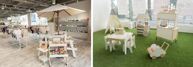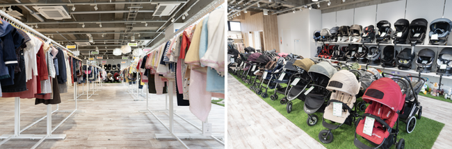 明るく天井が高い開放感のある空間や、キッズスペースを常設するなど従来のリユース店とは異なるキレイで居心地の良い店内にこだわっています。授乳室・おむつ替え台のあるベビーケアルームやお手洗いもベビーカーのまま入ることができ、通路も同様にベビーカーが通れる作りでお子様連れでも安心して利用できる店舗を心掛けています。また、こどもが自分で“お買い物”を体験できる “おもちゃの量り売り”ブースを設置。楽しみながら、モノやお金の大切さを学んでもらえます。