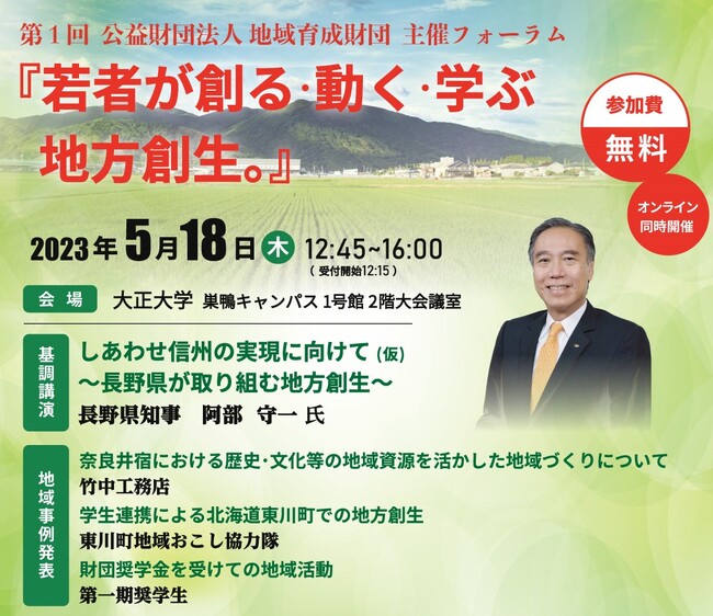 公益財団法人 地域育成財団(東京都豊島区、代表理事:横尾隆義)は、2023年5月18日(木)に大正大学およびオンラインにて『若者が創る・動く・学ぶ地方創生。フォーラム』を開催します。阿部守一 長野県知事、株式会社竹中工務店 高浜洋平氏、北海道東川町地域おこし協力隊 伊藤玲緒氏/関根弦氏、公益財団法人 地域育成財団 第一期奨学生 塚本健太氏が地方創生に関する講演を行います。会場は大正大学(東京都豊島区)およびオンライン同時開催で参加費は無料です。
