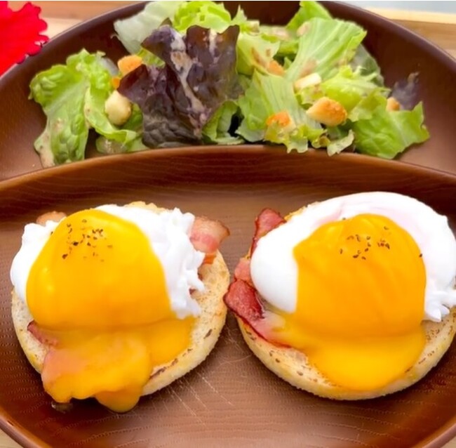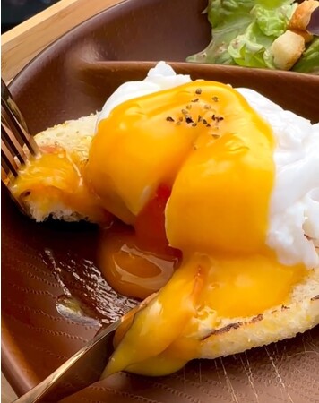 欧米の朝食定番!マフィンの上にベーコン、ポーチドエッグ、オリジナルソースをかけた相性抜群の一品です。すべての食材を厳選して仕入れているので、当店のエッグベネディクトの美味しさは格別です!とろとろたまごを割る瞬間が一番写真映えするので皆様も是非お試しください☆