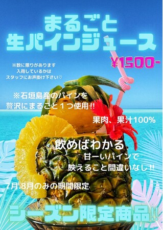 石垣島産のパイナップルを丸ごと1つ使用した生パインジュースが新登場!飲みごたえ満点、味良し、香り良し、写真写りも抜群の一品です☆農家直送の生パインを使用しているため、1日の販売個数に限りがございます。詳しくは当店スタッフまで♪