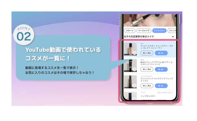 動画に登場するコスメを一覧で表示。お気に入りのコスメはすぐその場で保存することが可能。