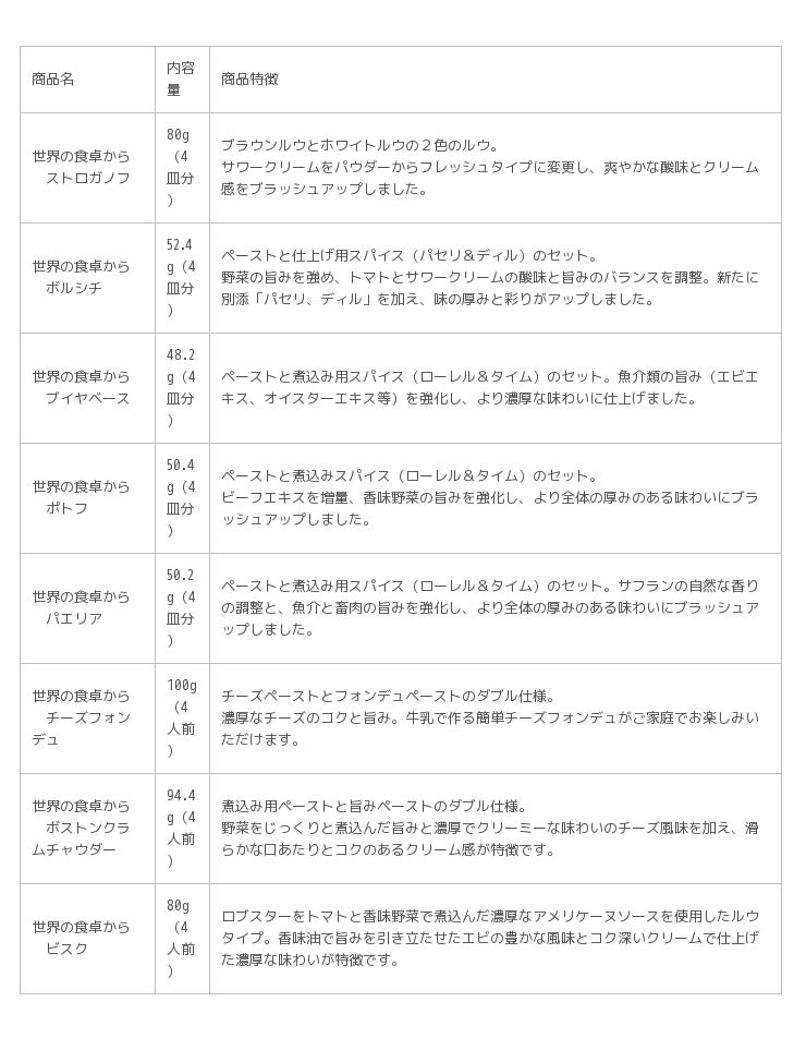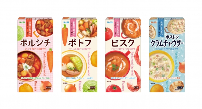エスビー食品株式会社は、世界の煮込み料理や鍋料理を手軽に楽しむ事ができるシリーズとして支持されている「世界の食卓から」シリーズ から<ボストンクラムチャウダー> <ビスク>を新発売、あわせて既存メニュー6品もリフレッシュします。