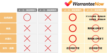 内容:「Warrantee Now」で製品登録した生活家電・デジタル家電に対し、スマートフォンアプリ上でいつでも保険加入および解約が可能なオンデマンド型保険サービス。24時間単位での保険加入が可能で、保険加入製品の自然故障・破損・水濡れに対応する。