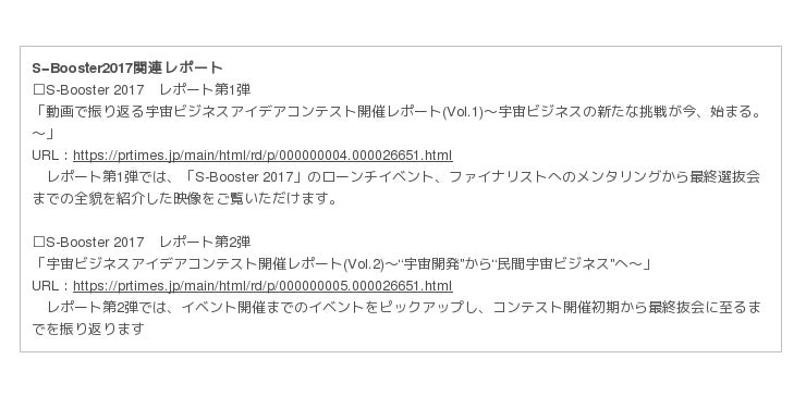 全4回に渡り「S-Booster 2017」の軌跡を振り返る当レポート。最終回である次回は、提案者をはじめとしたS-Booster関係者の生の声等、最終選抜会の裏側を掘り下げるとともに、宇宙ビジネスアイデアコンテスト「S-Booster」の今後の展開についても紹介する。