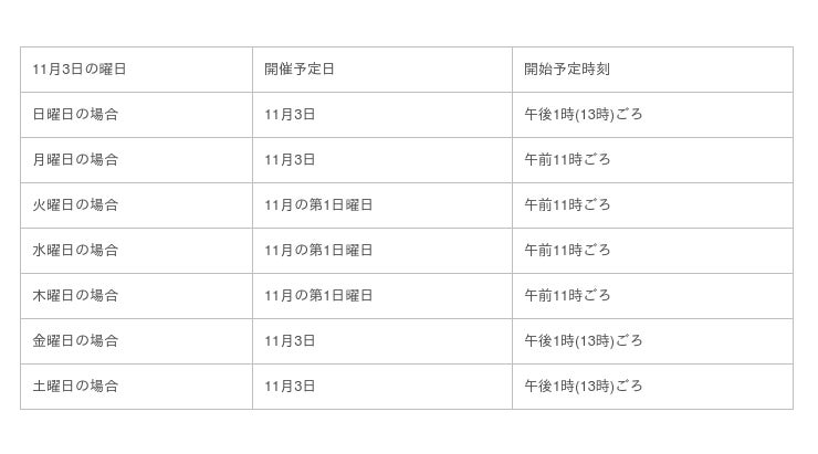 11月の第1日曜日または連休の一部たる文化の日(下表参照)