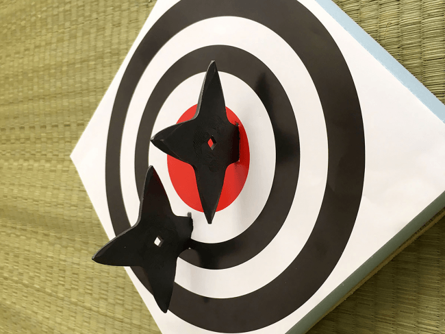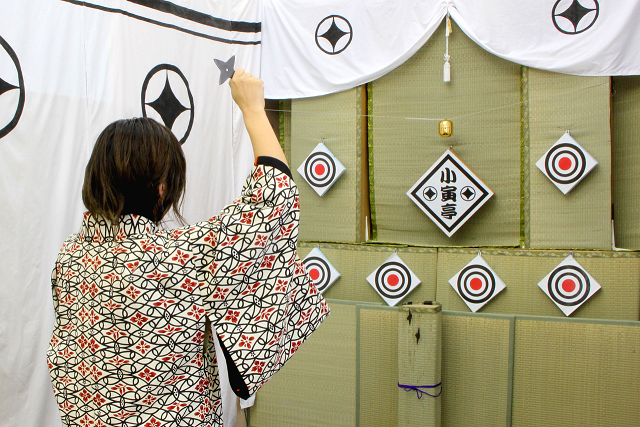 手裏剣は、本格的な鉄製の手裏剣を的に投げる忍者体験ができます。各種SNS用撮影や手裏剣大会等にも対応いたします。