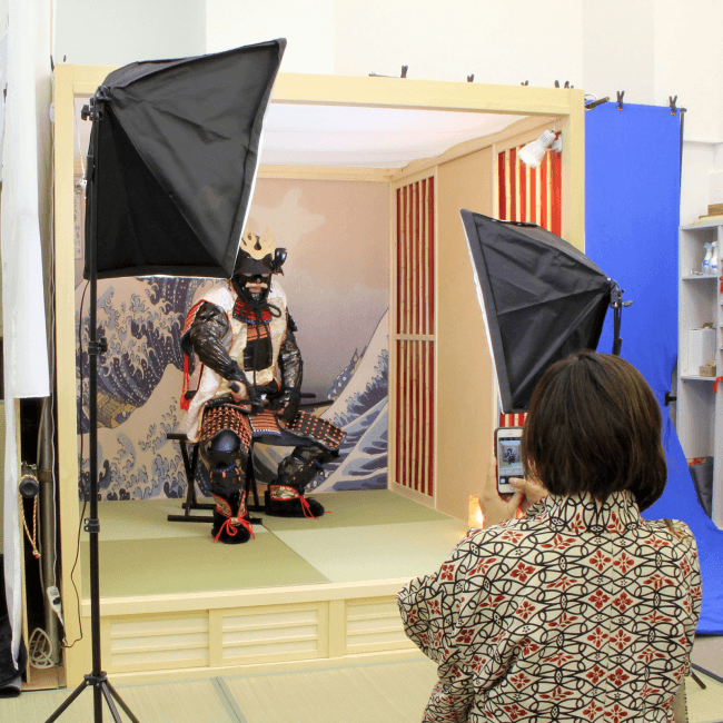 甲冑は、服の上から簡単に着付けが出来るプランを用意しておりますので8分で変身でき、そのまま店内に設置されたフォトスポットにて撮影ができます。水着での甲冑着用や、貸切での撮影会も可能です。