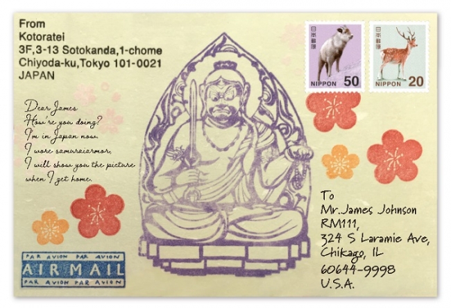 訪日旅行の記念としてエアメールを作成できるコーナーを作りました。浮世絵柄のポストカードに、用意された多くの「和柄ハンコ」で自由にデコレーションができます。メッセージを書いて店内のポストに投函すると母国にそれが届き、帰国した後でも旅行の余韻を感じることのできるサービスとして提供いたします。
