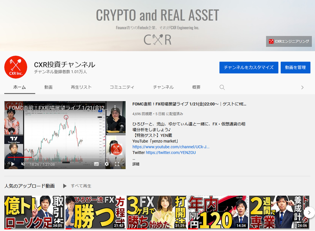 サブチャンネルとして、仮想通貨(暗号資産)に特化した「CXR仮想通貨チャンネル」や、アニメーションで金融知識を分かりやすく学べる「20代から始めるお金の増やし方」も運営しています。