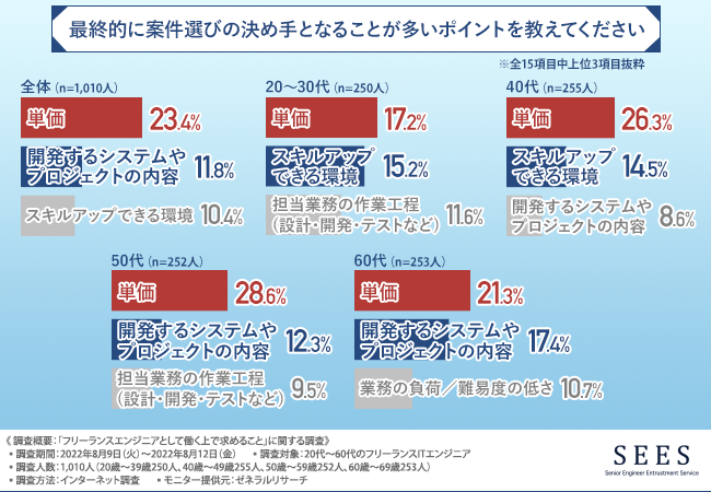 ・【60代】『単価(21.3%)』『開発するシステムやプロジェクトの内容(17.4%)』『業務の負荷/難易度の低さ(10.7%)』『契約期間/案件の継続性(10.7%)』『担当業務の作業工程(設計・開発・テストなど)(7.5%)』