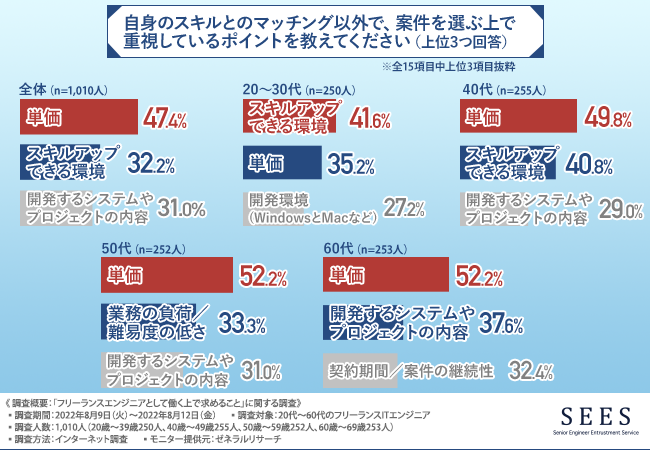 単価についてはどの年代でも重視する一方で、若い世代ほどスキルアップの環境を求めており、世代が上がるにつれてプロジェクトなどの内容で選んでいるようです。