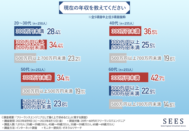 そこで今回、シニアエンジニア向けの求人案件検索サイト『SEES(Senior Engineer Entrustment Service)』(https://miraie-group.jp/sees)を運営する株式会社Miraie(https://miraie-group.jp/)は、20代〜60代のフリーランスITエンジニアを対象に、「フリーランスエンジニアとして働く上で求めること」に関する調査を実施しました。