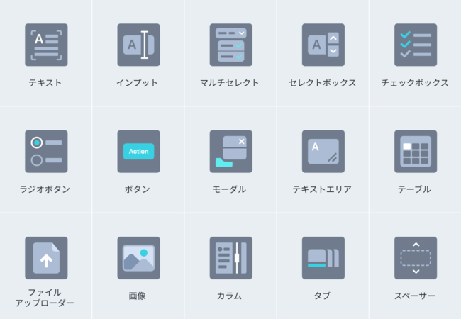 必要なUIコンポーネントをドラック&ドロップで配置します。カラムやタブなどレイアウト系のコンポーネントもご利用いただけます。