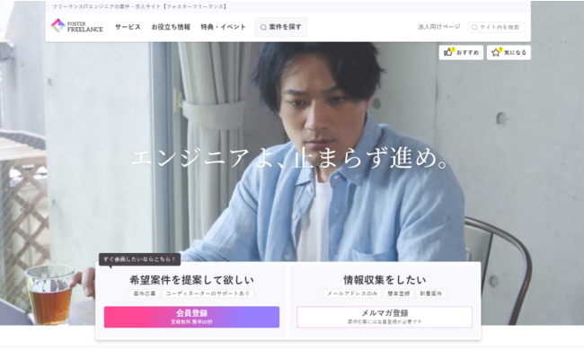 株式会社フォスターネット(本社:東京都新宿区、代表取締役会長:藤井正、以下、フォスターネット)は自社運営のITフリーランス支援サイト「フォスターフリーランス」の全面リニューアルを実施致しました。"エンジニアよ、止まらず進め。"をキャッチフレーズとし、引き続きITフリーランスを中心としたITエンジニアの方々を全面的に"応援"させていただきます。