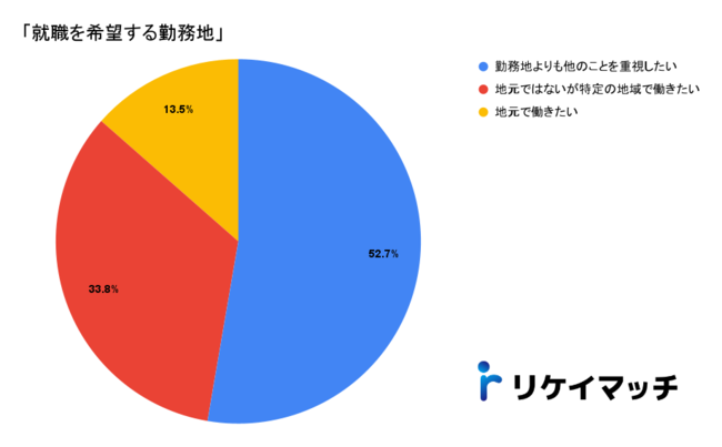 設問「就職を希望する勤務地」に対する回答は「勤務地よりも他のことを重視したい」が52.7%と過半数を占める結果となりました。一方、「地元ではないが特定の地域で働きたい」は33.8%となっており、地元にこだわらず就職したい傾向が伺えます。