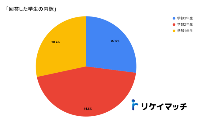 大学1〜3年生を対象にWEBアンケートを依頼したところ、最も多かったのは2年生の回答で、全回答者の44.6%を占める結果となりました。